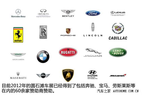 ??? 在贊助商方面,2012年的圓石灘車展到目前為止已經(jīng)有包括勞力士、蘭博基尼、寶馬、奔馳、法拉利等品牌在內(nèi)的60余家贊助商提供贊助,在現(xiàn)場你會看到很多這些品牌的廣告,當然這些品牌的廣告及贊助費的部分會被主辦方捐獻給慈善機構。