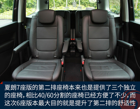 當(dāng)然作為這次新增的車款,我們還是要重點(diǎn)介紹一下夏朗6座版相對于7座版的區(qū)別。首先要說明的是夏朗7座版的第二排座椅本來也是提供了三個獨(dú)立的座椅,相比40/60分割的座椅已經(jīng)方便了不少,而這次提供的6座版本最大目的就是提升了第二排乘客的舒適性。