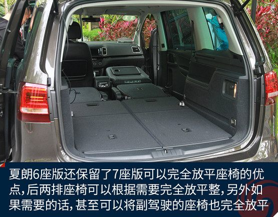 同時,夏朗6座版還保留了7座版可以完全放平座椅的優(yōu)點(diǎn),后兩排座椅可以根據(jù)需要完全放平整,只不過6座版在第二排中間會有個洞,不像7座版那么完美。另外如果需要的話,甚至可以將副駕駛的座椅也完全放平,將夏朗變成一款“商用車”。