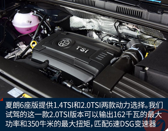 在動力方面,夏朗6座版也和7座版保持一致,提供1.4TSI和2.0TSI兩款動力選擇。我們試駕的這一款搭載第三代2.0T EA888發(fā)動機(jī),可以輸出162千瓦的最大功率和350牛米的最大扭矩,并且匹配6速DSG雙離合變速器。