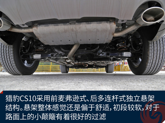 獵豹CS10采用前麥弗遜式、后多連桿式獨(dú)立懸架結(jié)構(gòu),相比同級別扭力梁車型多多少少提升了一定的操控感。懸架整體感覺還是偏于舒適,初段較軟,對于路面上的小顛簸有著很好的過濾,在彎中的支撐力也較有韌性,過彎時的側(cè)傾控制的比較不錯。