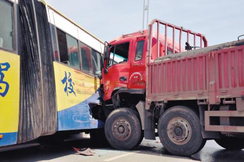 ????????記者觀察到,大客車側(cè)面寫有“交通駕校”一行大字,車頭朝西車尾朝東停著,右側(cè)車身被橋墩緊緊卡??;運(yùn)水罐車長近20米,車身與大客車車身幾乎呈90度直角,運(yùn)水罐車車頭撞在大客車的左后側(cè),將大客車撞癟了。事發(fā)地點(diǎn)位于橋坡處,地面遍布七零八落的玻璃碎片,運(yùn)水罐車下面還有少量血跡。運(yùn)水罐車和大客車內(nèi)均空無一人。
