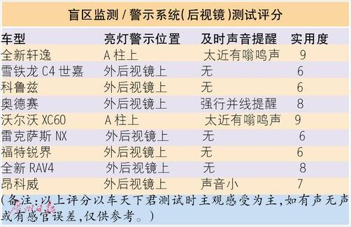 測試車型當中,同樣不會吵的,還有雪鐵龍C4世嘉、福特銳界、雷克薩斯NX等車型,對盲區(qū)內(nèi)的車輛感應非常靈敏,當我們駕駛車輛將要變換車道,而側(cè)后方雷達同時感應到有車輛進入后視鏡盲點區(qū)域時,外后視鏡上的指示燈就會閃爍,提醒駕駛者注意后車。