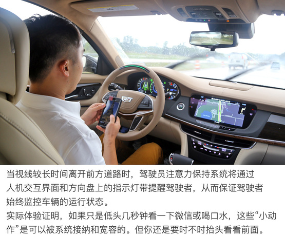 ????????原則上駕駛員應(yīng)該緊盯前方,時(shí)刻準(zhǔn)備著接管汽車的控制權(quán)。但實(shí)際上基于ACC自適應(yīng)巡航系統(tǒng)的Super Cruise?超級(jí)巡航為行駛中的汽車提供了充足的“安全緩沖余量”。在底特律郊區(qū)高速公路上實(shí)際體驗(yàn)證明,視線短暫的離開正前方(大約3-5秒之內(nèi))處于系統(tǒng)安全的“可接受”范圍內(nèi),比如喝水、吃東西或者調(diào)節(jié)空調(diào)多媒體娛樂系統(tǒng),這些操作都沒什么問題。