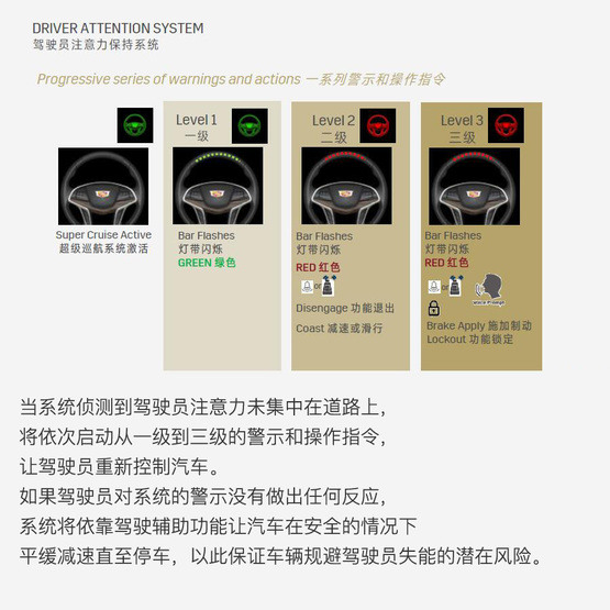 ????????若這個(gè)級(jí)別的警示還不能“喚醒”駕駛者,超級(jí)巡航系統(tǒng)將自動(dòng)開啟雙閃、利用車輛輔助駕駛系統(tǒng)控制汽車逐漸減速并在路邊停車,然后OnStar安吉星工作人員將會(huì)通過遠(yuǎn)程對(duì)話介入以防止駕駛者因?yàn)椤笆堋痹斐筛嗖豢深A(yù)知的危險(xiǎn)。