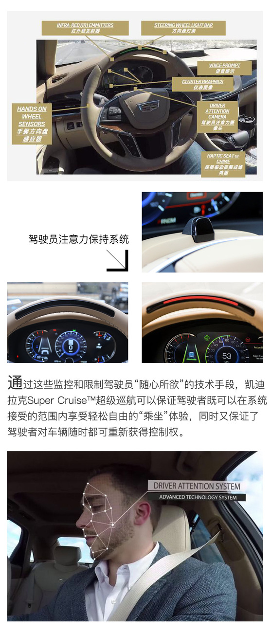 ????????但問題是,當(dāng)一臺(tái)車自己好好的行駛在高速公路上,人性驅(qū)使下的駕駛員很容易把注意力轉(zhuǎn)移到其它地方,這就造成了極大的安全隱患。所以凱迪拉克Super Cruise?超級(jí)巡航系統(tǒng)最與眾不同的地方,也是讓我覺得最有價(jià)推廣價(jià)值的設(shè)計(jì)理念,是通過駕駛員注意力保持系統(tǒng)與高精度地圖數(shù)據(jù)緊密結(jié)合?,主動(dòng)監(jiān)測(cè)駕駛員的狀態(tài)并做出及時(shí)回應(yīng)。這套系統(tǒng)能督促駕駛者始終保持對(duì)車輛運(yùn)行狀態(tài)的有效監(jiān)控,這給其釋放雙手的駕駛輔助功能帶來更安全、更自信的使用體驗(yàn)。