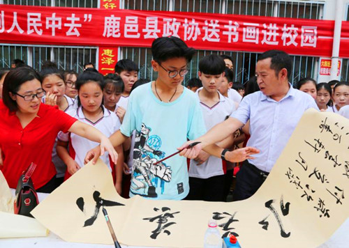 中華龍都網(wǎng)訊(周口報業(yè)全媒體記者 李瑞才 通訊員 孫廣合 胡洪濤)6月26日上午,鹿邑縣政協(xié)和縣文聯(lián)聯(lián)合開展“到人民中去”送書畫進校園活動,組織10余位知名書畫家走進校園,現(xiàn)場揮毫潑墨,為師生義寫字畫。