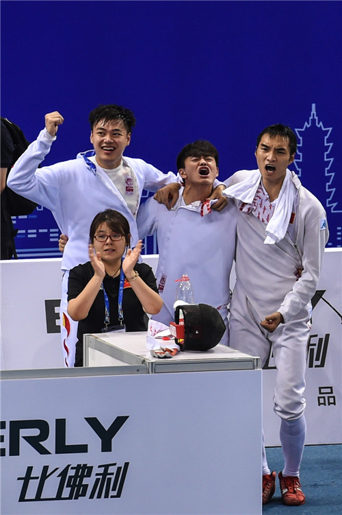 7月25日,在江蘇省無錫市舉行的2018世界擊劍錦標賽男子重劍團體賽16進8的比賽中,中國隊以45∶36戰(zhàn)勝烏克蘭隊,晉級八強。