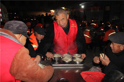 “環(huán)衛(wèi)工人平均年齡都在60歲以上,牙口不好,是‘愛心粥屋’和志愿者給我們精心調(diào)制的雞蛋韭菜餡餃子,味鮮、好吃、正合老年人的口味,感謝黨、感謝志愿者不畏寒冷、不怕辛苦給我們端吃端喝,就是在家也沒有這么好的待遇?!杯h(huán)衛(wèi)工人李大娘感激地說。