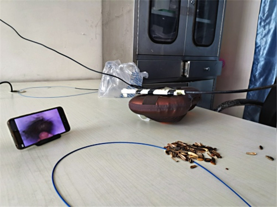 記者看到徐醫(yī)生自制的呼吸內(nèi)鏡,胸部是用一個家用電動按摩枕代替的,用來能模擬人的胸部呼吸起伏;按摩枕上固定了兩個用打印紙卷成的小紙筒,用來代替氣管;屏幕是用手機(jī)代替的,用WIFI和氣管鏡鏈接,影像可以通過手機(jī)屏幕看到;內(nèi)鏡手柄是徐醫(yī)生用膠泥結(jié)合真實(shí)設(shè)備形狀、重量捏制而成的。當(dāng)著記者的面,徐醫(yī)生把一小半瓜子皮放入模擬人體氣管的紙筒,在手機(jī)屏幕的導(dǎo)航下通過氣管鏡到達(dá)異物所在位置,熟練地用異物鉗夾出異物。