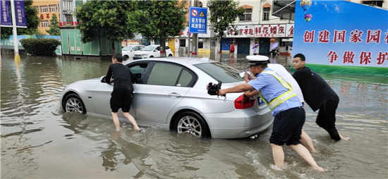 推車、砍樹、疏導……直屬各大隊民警分赴市區(qū)眾多積水路口路段,或冒雨指揮交通、或徒手清理下水道堵塞物及路面雜物、或在水深過膝路段幫助老人和小孩過馬路。