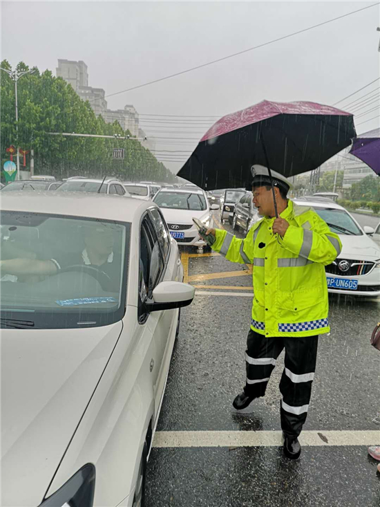 大雨滂沱,交通擁堵。7月22日,針對市區(qū)降大雨且部分路段出現(xiàn)嚴重積水的情況,交警及時啟動惡劣天氣應(yīng)急預案,迅速投入到工作中。
