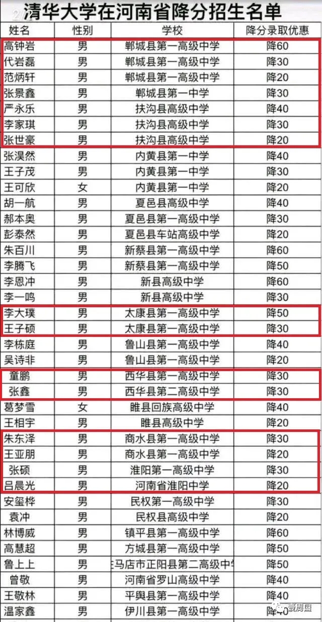 其中北京大學最高降分為40分,最低降分為10分。清華大學在河南招生最高降分為60分,最低降分為20分。