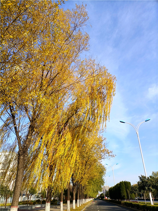 冬日暖陽照三川,垂柳更換鵝黃衫。無盡情思春可寄,千條萬條隨風翩。12月15日,我市天氣晴朗,路旁一排排垂柳隨風搖曳,像一個個舞動的小精靈,又像一團團鵝黃色的薄霧,如此美不勝收的風景就像一幅畫,令人忍不住駐足欣賞。