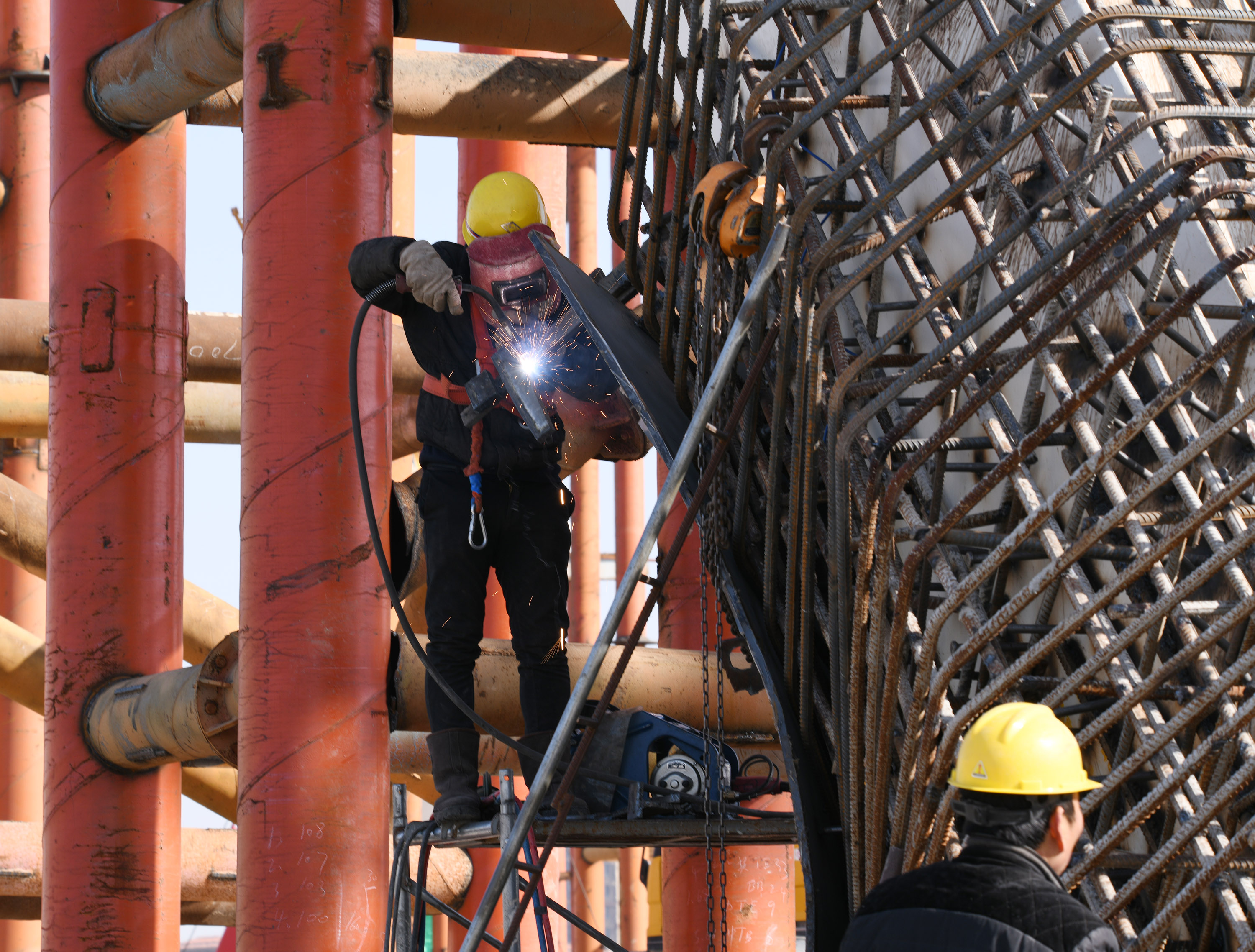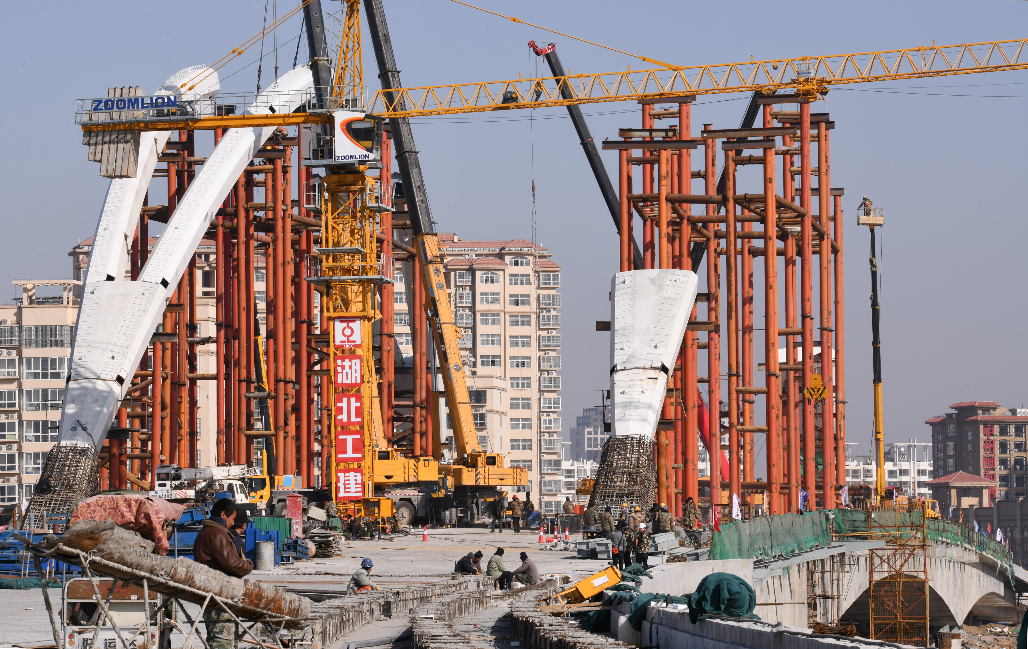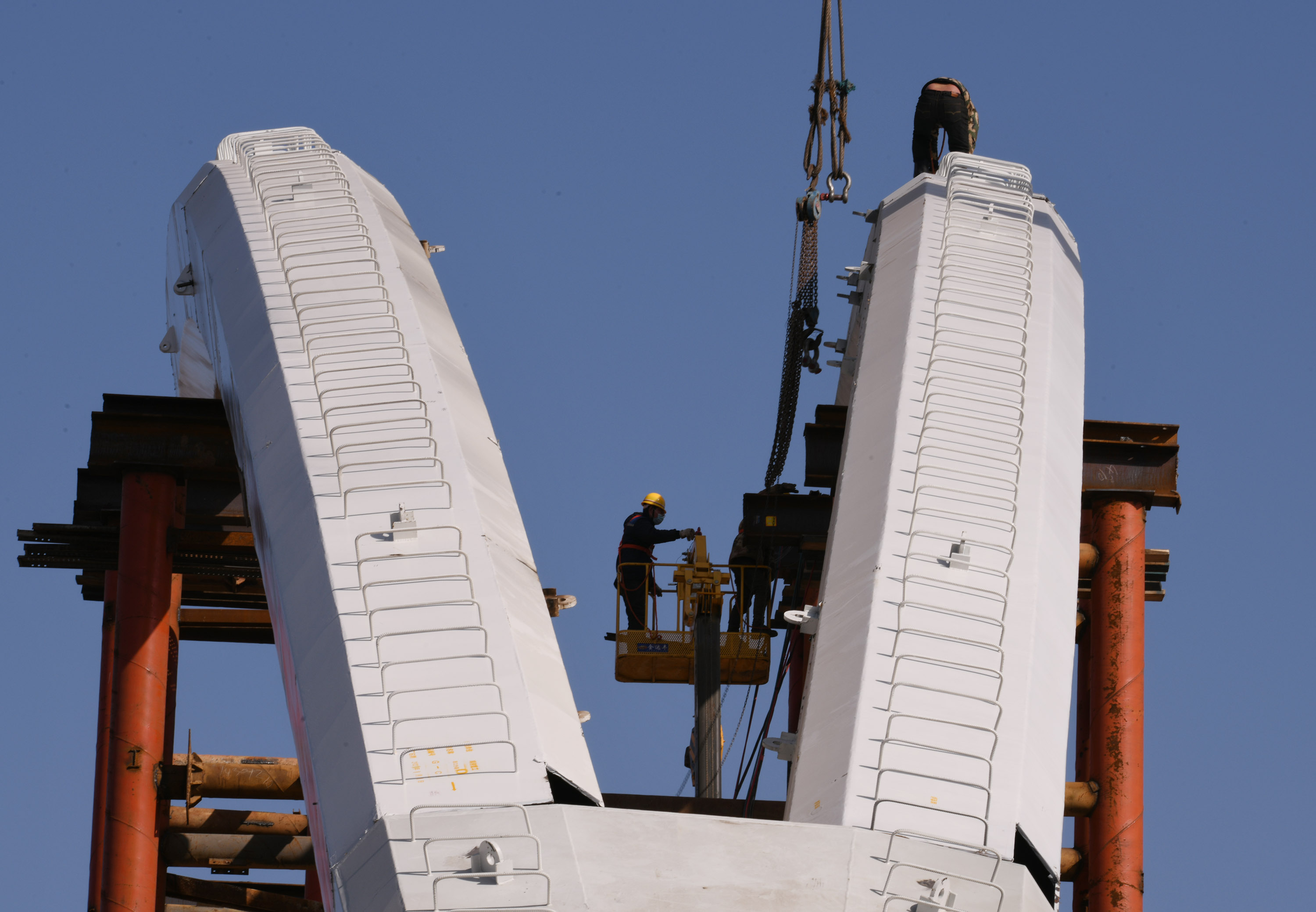 “一輪明月照古城”是中原路跨沙潁河大橋在諸多跨沙潁河大橋中獨(dú)居特色的風(fēng)情。眼下,中原路跨沙潁河大橋合攏之后,橋面建設(shè)處于緊鑼密鼓之中,并開始進(jìn)入安裝“月亮”施工階段。記者在施工工地看到,吊車往來,吊臂上下吊裝著材料,隨著工人們忙碌地焊接、安裝,“月牙”已經(jīng)乍現(xiàn)。
