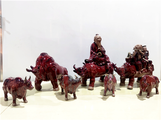 春節(jié)前夕,鄲城泥塑大師張振福歷時多日制作一組鈞瓷泥塑群雕《瑞牛賀新春》。該組作品分為三頭長約90厘米的大牛和若干頭小牛,均為鈞瓷泥塑,采用豫東黃泥和粗獷手法制作,上釉時入窯一色,歷經(jīng)1200多攝氏度高溫?zé)坪蟪龈G萬變,十分精彩。拓荒牛精神,展現(xiàn)中國人自立自強(qiáng)的志氣;孺子牛精神,體現(xiàn)在創(chuàng)造美好生活的時代課題中;老黃牛精神,貴在“心有大我、至誠報國”的奉獻(xiàn)品格。