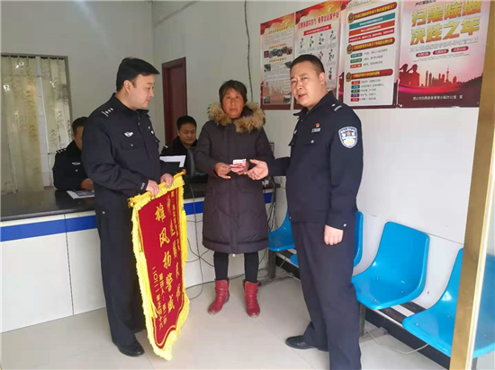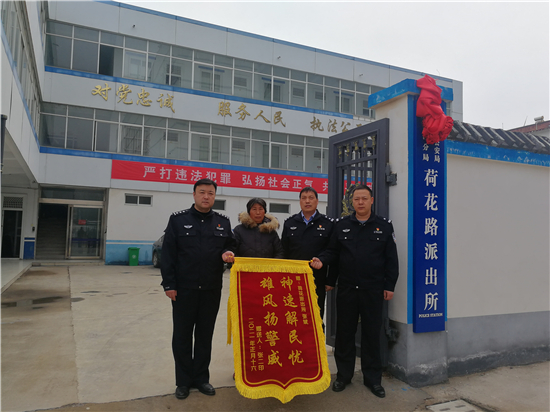 2月27日上午,一名群眾將寫著“神速解民憂 雄風揚警威”錦旗送到川匯公安分局荷花路派出所民警手中,感謝民警們的辛苦付出。錦旗背后的故事還得從一條抖音說起。