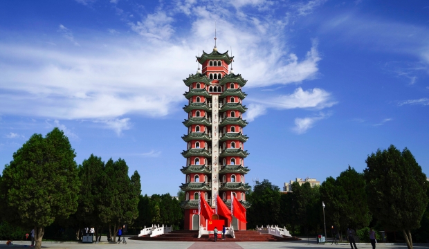 在甘肅省白銀市會(huì)寧縣紅軍會(huì)寧會(huì)師舊址內(nèi),有一座高33.33米,呈三塔環(huán)抱雄姿的紀(jì)念塔——中國工農(nóng)紅軍第一二四方面軍會(huì)師紀(jì)念塔。