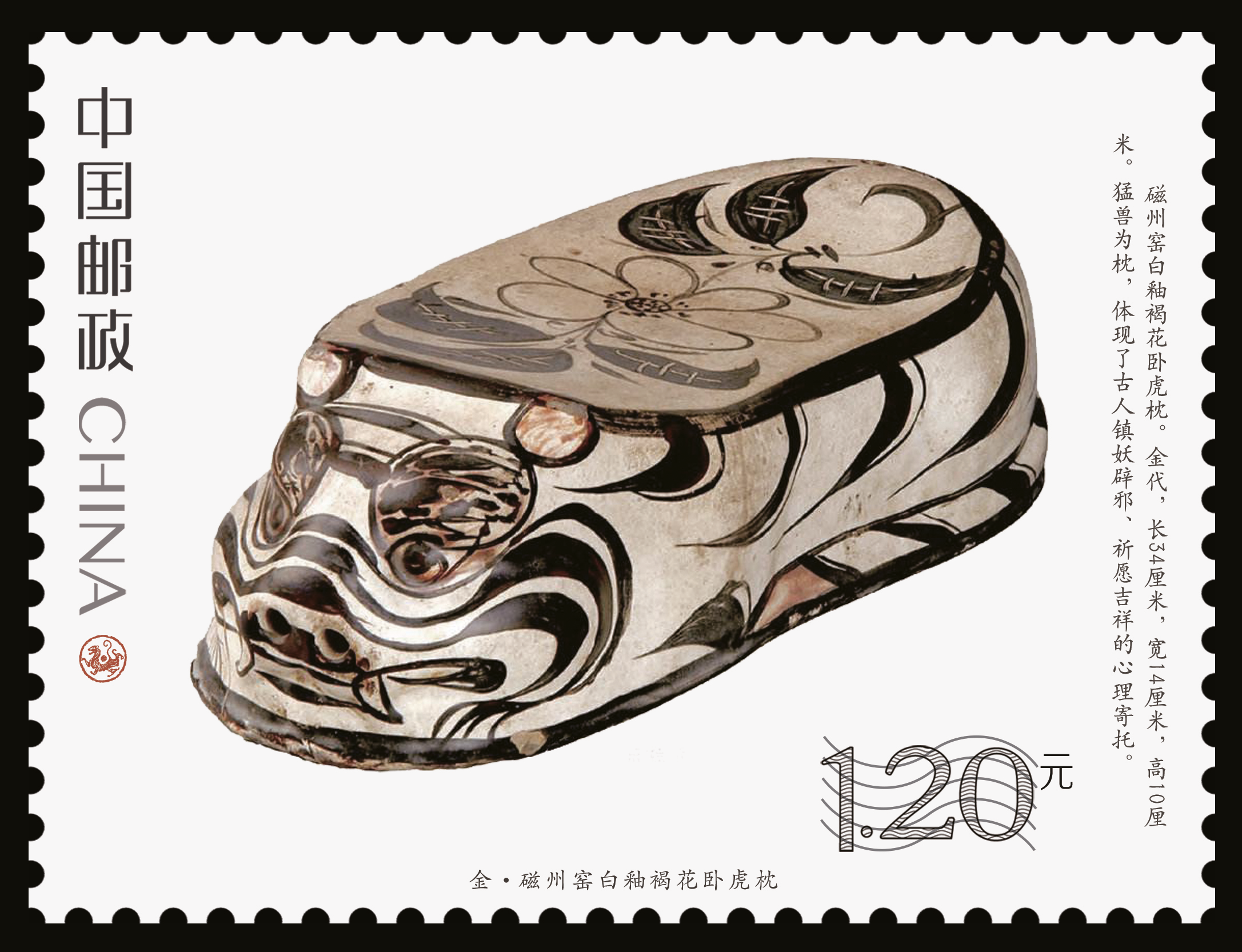 9月5日,由中國(guó)郵政特別制作的《虎文物》特種郵票正式發(fā)行。此套郵票共有6枚,每枚上都印有一件珍貴的虎文物。郵票圖案名稱(chēng)分別為“商·伏鳥(niǎo)雙尾青銅虎”“春秋·青玉虎形佩”“漢·白虎瓦當(dāng)”“漢·錯(cuò)金銘文銅虎節(jié)”“金·磁州窯白釉褐花臥虎枕”“清·皮影飛虎”。其中第五枚郵票圖案中的“金·磁州窯白釉褐花臥虎枕”就是來(lái)自周口市博物館的珍貴文物。