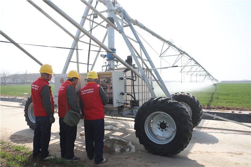 放眼望去,一座座白色的標準化通電機井房坐落在麥田地頭,源源不斷的井水流進蓄水池里,不斷冒出歡快的水花。一旁的大型電動平移式噴灌機把井水過濾后,澆灌出一片片盎然綠意。遠處身穿紅馬甲、頭戴安全帽的供電檢修人員正在對抽水專變進行認真細致地檢查。