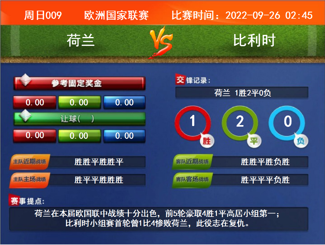 比賽時(shí)間:2022-09-26 02:45賽事提點(diǎn):荷蘭在本屆歐國聯(lián)中戰(zhàn)績十分出色,前5輪豪取4勝1平高居小組第一;比利時(shí)小組賽首輪曾1比4慘敗荷蘭,此役志在復(fù)仇。