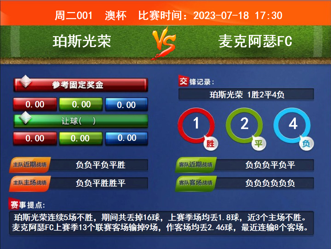 比賽時間:2023-07-18 17:30賽事提點(diǎn):珀斯光榮連續(xù)5場不勝,期間共丟掉16球,上賽季場均丟1.8球,近3個主場不勝。麥克阿瑟FC上賽季13個聯(lián)賽客場輸?shù)?場,作客場均丟2.46球,最近連輸8個客場。