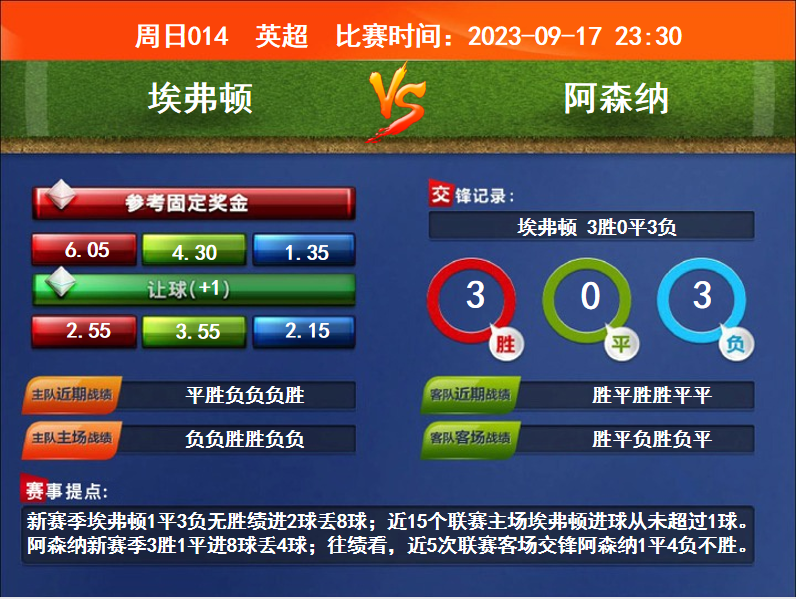 比賽時間:2023-09-17 23:30賽事提點:新賽季埃弗頓1平3負無勝績進2球丟8球;近15個聯(lián)賽主場埃弗頓進球從未超過1球。阿森納新賽季3勝1平進8球丟4球;往績看,近5次聯(lián)賽客場交鋒阿森納1平4負不勝。
