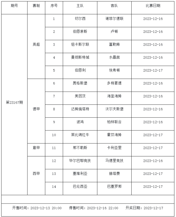 足球彩票勝負(fù)游戲(14場(chǎng)和任選9場(chǎng))第23167期賽程: