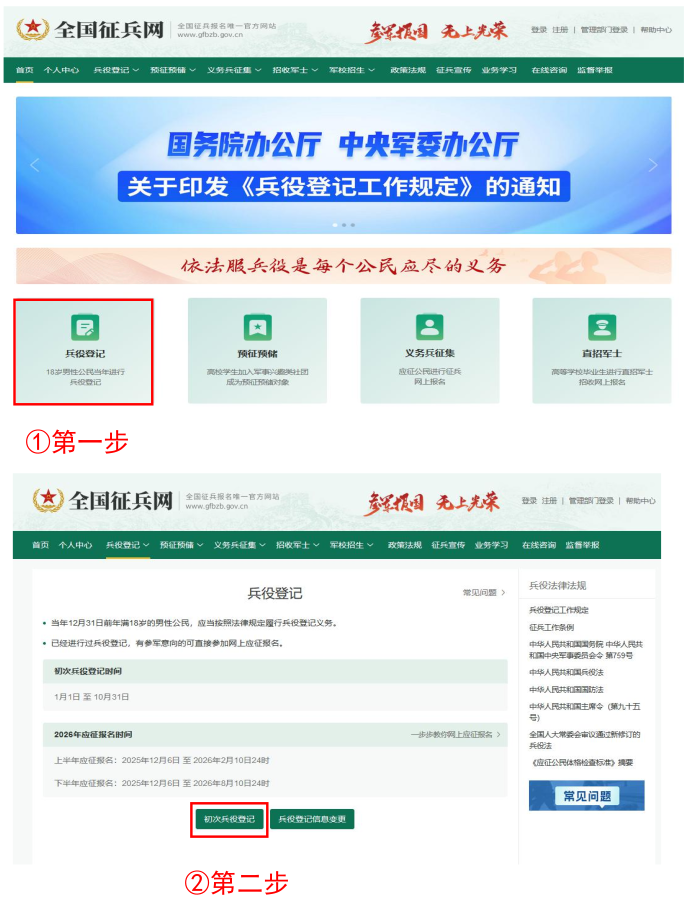《中華人民共和國兵役法》規(guī)定,“國家實(shí)行兵役登記制度。兵役登記包括初次兵役登記和預(yù)備役登記。每年十二月三十一日以前年滿十八周歲的男性公民,都應(yīng)當(dāng)按照兵役機(jī)關(guān)的安排在當(dāng)年進(jìn)行初次兵役登記”。參加兵役登記是法律賦予每個(gè)適齡男性公民應(yīng)盡的光榮義務(wù)和神圣責(zé)任,應(yīng)自覺按時(shí)進(jìn)行登記或核對。