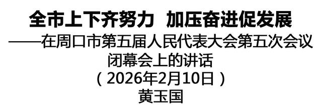 會議期間,各位代表以飽滿的政治熱情、強烈的責任擔當,依法履職盡責、積極建言獻策,審議通過了政府工作報告、“十五五”規(guī)劃綱要和其他各項報告文件,順利完成了各項選舉任務(wù)。會議開得很成功,是一次高舉旗幟、牢記囑托的大會,是一次集思廣益、民主團結(jié)的大會,是一次振奮人心、催人奮進的大會,必將鼓舞全市人民以更加堅定的信心、更加昂揚的斗志,奮力譜寫中原大地推進中國式現(xiàn)代化周口新篇章。在此,我代表中共周口市委,向會議的成功召開表示熱烈祝賀!向各位代表和全體工作人員的辛勤付出表示衷心感謝!