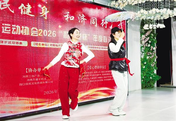 健步走愛(ài)好者展示自編自演的健身操。近日,周口市健步走協(xié)會(huì)年會(huì)在周口中心城區(qū)世紀(jì)星酒店舉行,50多支健步隊(duì)、數(shù)百名愛(ài)好者齊聚一堂,共迎新春、共話健康。記者 徐啟峰 攝影