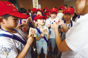 小記者們按照要求學(xué)起四指點(diǎn)鈔法,可手指怎么也不聽使喚。銀行的阿姨告訴他們竅門:先將一沓點(diǎn)鈔紙彎成扇形,然后每根手指撥動一張點(diǎn)鈔紙。很快,小記者們就熟練了許多。